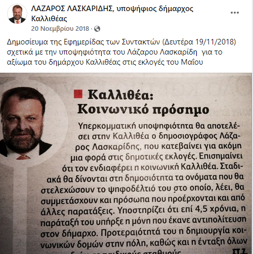 Ο καθένας μπορεί να βρει δηλώσεις του υποψηφίου δημάρχου Καλλιθέας κ. Λασκαρίδη στο διαδίκτυο και φυσικά η επιλογή του για θέση ευθύνης από τον κ. Κάρναβο είναι στο πλαίσιο στο πάνω από κόμματα και χρώματα, με σήμα την "ΚΟΥΤΑΛΑ"!
