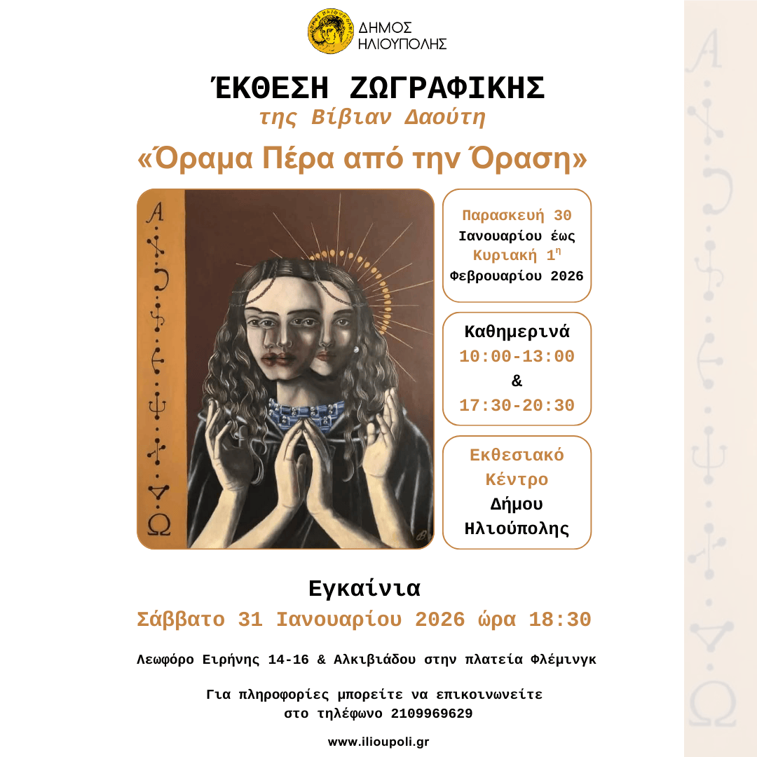 O Δήμος Ηλιούπολης έχει την τιμή να σας προσκαλέσει στην Έκθεση Ζωγραφικής της Βίβιαν Δαούτη με τίτλο «Όραμα Πέρα από την Όραση». Η έκθεση θα λάβει χώρα στο Εκθεσιακό Κέντρο του Δήμου Ηλιούπολης (Λεωφόρος Ειρήνης 14-16 & Αλκιβιάδου στην πλατεία Φλέμινγκ) από την Παρασκευή 30 Ιανουαρίου 2026 έως την Κυριακή 1η Φεβρουαρίου 2026, καθημερινά 10:00 έως 13:00 το πρωί και 17:30 έως 20:30 το βράδυ.