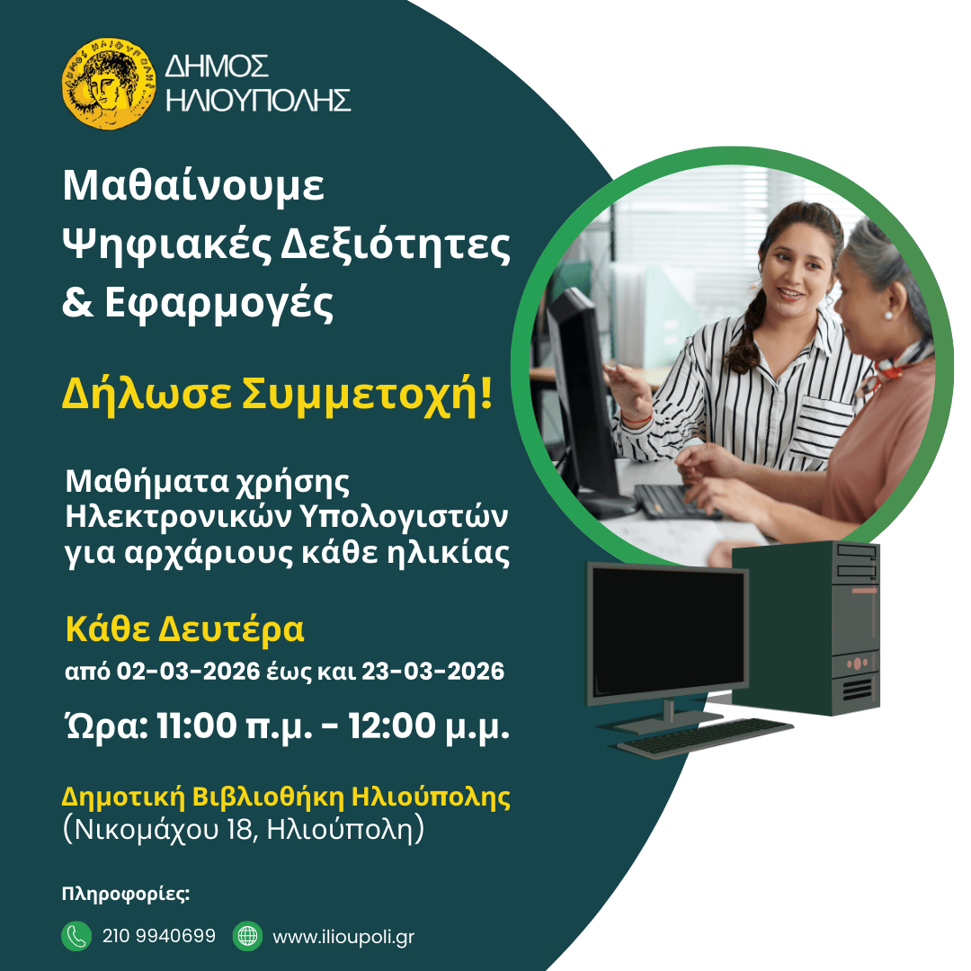 Το πρόγραμμα θα πραγματοποιηθεί στις εγκαταστάσεις του Media Lab της Βιβλιοθήκης του Δήμου Ηλιούπολης κάθε Δευτέρα, 11:00-12:00 από 02-03-2026 έως και 23-03-2026 και απευθύνεται κατά κύριο λόγο σε αρχάριους χρήστες υπολογιστών κάθε ηλικίας που θέλουν να βελτιώσουν τις ψηφιακές τους ικανότητες και να αναβαθμίσουν τις γνώσεις τους.
